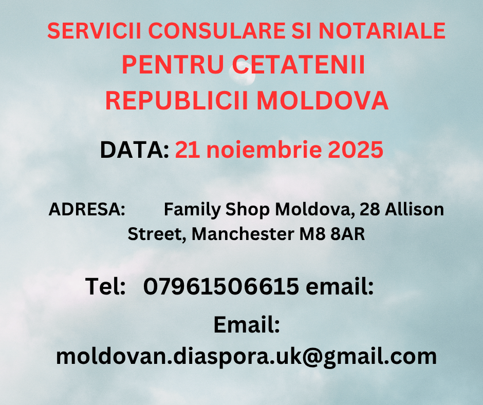 EN, RO[RO] Serviciile Consulare Itinerante vor avea loc la Manchester pe 21 noiembrie 2025. Această inițiativă comună dintre Moldovan Diaspora Business Alliance și Ambasada Republicii Moldova în Regatul Unit aduce un sprijin esențial mai aproape de comunitatea noastră. Mulți oameni din Regatul Unit au nevoie de servicii consulare și notariale, dar le este dificil să călătorească […]
